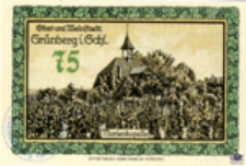 awers: po środku herb miasta, z lewej strony tkacz z czółnem, z prawej strony winiarz z kiścią winogron; kolor czarny, zielony, czerwony ; rewers: widok kaplicy Najświętszej Maryi Panny, ul. Aliny; kolor jasnozielony ; notgeld emitowany przez Magistrat m. Grünberg ; 95 mm x 65 mm