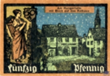 awers: w środku herb miasta, z lewej strony patera owoców i kielich wina, po prawej stronie głowa barana ; rewers: widok z placu pod Wieżą Głodową na wieżę Ratusza ; notgeld emitowany przez Magistrat m. Grünberg ; 90 mm x 60 mm