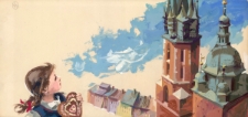 gwasz, karton ; 24,5 x 51 cm ; Ilustracja zabezpieczona kalką techniczną ; Projekt il. ze s. 11 ; Przedstawia: Z lewej strony kompozycji dziewczynka z warkoczami, ubrana po krakowsku, w ujęciu od ramion w górę. W dłoni trzyma serce z piernika i patrzy na wieże krakowskiego kościoła Mariackiego. W dole rząd ciasno stojących obok siebie kamieniczek. Niebo pełne błękitu.