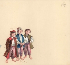 gwasz, karton ; 24,5 x 28 cm ; Projekt il. ze s. 22 ; Przedstawia: Trzech małych bosonogich pastuszków. Chłopcy mają na sobie ludowe stroje. Spodnie pasiaste, białe koszule i kamizele. Jeden z nich nosi strój krakowski. W rękach jeden trzyma gałązkę, drugi bacik.