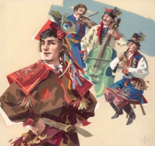 gwasz, karton ; 24,5 x 28 cm ; Projekt il. ze s. 39 ; Ilustracja zabezpieczona kalką techniczną ; Przedstawia: Na drugim planie gra kapela ludowa składająca się z trojga mężczyzn. Ubrani są w odświętne krakowskie stroje. Na pierwszym planie tańczący mężczyzna w krakowskim stroju i rogatywce z pawim piórem.