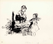 27 x 32,5 cm ; czarny tusz, biały gwasz, karton ; Czas powstania : [1965] ; Przedstawia: Na stercie ściętego drzewa siedzi chłopiec i podpiera ręką brodę. Jest boso. Patrzy na dziewczynkę stojącą przed nim z bukietem kwiatów w dłoniach.
