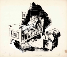 30 x 35 cm ; czarny tusz, biały gwasz, karton ; Czas powstania : [1965] ; Przedstawia: Pokój dziecinny. W łóżeczku podnosi się chłopiec i ze zdziwieniem na twarzy patrzy na otwierająca się wielką skrzynię. Na brzegu kufra stoi mały pingwinek i patrzy na chłopca.