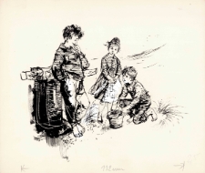 29 x 34,5 cm ; czarny tusz, biały gwasz, karton ; Czas powstania : [1965] ; Przedstawia: Grupa dzieci. Mały chłopiec pochyla się nad wiaderkiem i patrzy w stronę starszego chłopca. Obok stoi dziewczynka w kraciastej sukience i przygląda się chłopcom.