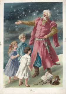34,0 x 23,5 cm ; tempera, karton ; Czas powstania : [1958] ; Projekt ilustracji wykorzystany w książce Ewy Szelburg-Zarembiny "Królestwo Bajki" ; Na odwrocie dwie pieczęcie czerwonym tuszem: "NASZA KSIĘGARNIA" oraz "PROSIMY NIE NISZCZYĆ ORYGINAŁÓW". W prawym dolnym narożniku 3 nieczytelne podpisy [w tym Zdzisława Rychlickiego?] i data 12.XII.58. Podpis ołówkiem: "Królestwo bajki" str. 154" ; Projekt ilustracji zakupiony po wystawie indywidualnej Marii Orłowskiej-Gabryś w maju 1990 roku od syna nieżyjącej artystki ; Przedstawia : Mężczyznę w polskim stroju szlacheckim, z szablą u boku, oraz trójkę dzieci - dwóch chłopców i dziewczynkę, stojących przed nim. W tle - granatowe, usiane gwiazdami niebo. Akcja rozgrywa się najprawdobniej na Księżycu i przedstawia spotkanie dzieci z Panem Twardowskim, który żywo o czymś opowiada. U jego sóp leży otwarta książka, czapka obszyta futrem, zdobiona pawim piórem oraz różaniec. Dzieci ubrane w nocne stroje. Twardowski w karmazynowym kontuszu i złocistym żupanie, karabela zawieszona na ozdobnym pasie z turkusami; rękojeść i pochwa także wysadzane turkusami. Szerokie spodnie, typu pantalony, w odcieniu turkusowym, wysokie buty z cholewami.