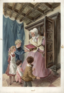 33,5 x 23,5 cm ; Projekt ilustracji wykorzystany w książce Ewy Szelburg-Zarembiny "Królestwo Bajki" ; Czas powstania : [1958] ; Projekt ilustracji zakupiony po wystawie indywidualnej Marii Orłowskiej-Gabryś w maju 1990 roku od syna nieżyjącej artystki ; tempera, karton ; Przedstawia : Grupę dzieci, którym staruszka w długiej sukni i białym czepcu na głowie podaje wielką, ozdobnie oprawioną, księgę ze starej szafy. Staruszka uśmiecha się życzliwie, dzieci mają jednak bardzo przejęte miny. Chłopiec na pierwszym planie odwrócony plecami, jakby cofał sie w przestrachu, drugi chłopiec wyciąga ręce po książkę. Obok niego stoi dziewczynka w ciemnoczerwonej sukience z białym kołnierzykiem i białym, w różowe plamki, fartuszku; ręce trzyma założone do tyłu, długie, jasne włosy związane w ogon różowa kokardą. Przed nią malutki chłopczyk ubrany na różowo, w białym fartuszku. Scena rozgrywa się w komnacie z bogato rzeźbionym kasetonowym stropem i dekoracyjną podłogą. Szafa na książki również ozdobna, jej drzwi rzeźbione w kasetony.Projekt całostronicowej, barwnej ilustracji.