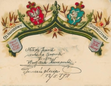 Poznań, 12.8.1911 ; Telegram patriotyczny z życzeniami dla młodej pary ; Zwyczaj wysyłania ozdobnych telegramów gratulacyjnych należy datować na 1884 rok, czyli na stulecie powstania kościuszkowskiego (na pierwszych drukach pojawił się wizerunek Tadeusza Kościuszki, dlatego były one zwane telegramami kościuszkowskimi). ; Pierwsze edycje miały miejsce w Krakowie, ale szybko inicjatywę przejęli poznaniacy, zwłaszcza związani z Towarzystwem Czytelni Ludowych w Poznaniu. ; Były to kolorowe blankiety o tematyce patriotyczno-historycznej do życzeń świątecznych, narodowych, rodzinnych, osobistych. ; Na blankietach prezentowano widoki miast m.in. Poznania, Krakowa, Gniezna oraz godło, herby i inne symbole narodowe. ; Ideą kolportowania tych telegramów o niezwykłym ładunku treści patriotycznych zawartych w ilustracjach i napisach, było zdobywanie funduszy, głównie na walkę o niepodległość z zaborcami oraz na oświatę. ; Cena tych telegramów znacznie przewyższała cenę zwykłych urzędowych formularzy (jeden telegram kosztował 25 fenigów). ; Początkowo drukowano je w zakładzie litograficznym Antoniego Rose w Poznaniu.