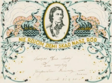 Lwówek, 21.4.30 ; Telegram patriotyczny z życzeniami dla młodej pary ; Zwyczaj wysyłania ozdobnych telegramów gratulacyjnych należy datować na 1884 rok, czyli na stulecie powstania kościuszkowskiego (na pierwszych drukach pojawił się wizerunek Tadeusza Kościuszki, dlatego były one zwane telegramami kościuszkowskimi). ; Pierwsze edycje miały miejsce w Krakowie, ale szybko inicjatywę przejęli poznaniacy, zwłaszcza związani z Towarzystwem Czytelni Ludowych w Poznaniu. ; Były to kolorowe blankiety o tematyce patriotyczno-historycznej do życzeń świątecznych, narodowych, rodzinnych, osobistych. ; Na blankietach prezentowano widoki miast m.in. Poznania, Krakowa, Gniezna oraz godło, herby i inne symbole narodowe. ; Ideą kolportowania tych telegramów o niezwykłym ładunku treści patriotycznych zawartych w ilustracjach i napisach, było zdobywanie funduszy, głównie na walkę o niepodległość z zaborcami oraz na oświatę. ; Cena tych telegramów znacznie przewyższała cenę zwykłych urzędowych formularzy (jeden telegram kosztował 25 fenigów). ; Początkowo drukowano je w zakładzie litograficznym Antoniego Rose w Poznaniu.