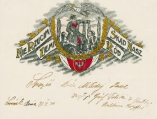Lwówek, dnia 21.IV.30 ; Telegram patriotyczny z życzeniami dla młodej pary ; Zwyczaj wysyłania ozdobnych telegramów gratulacyjnych należy datować na 1884 rok, czyli na stulecie powstania kościuszkowskiego (na pierwszych drukach pojawił się wizerunek Tadeusza Kościuszki, dlatego były one zwane telegramami kościuszkowskimi). ; Pierwsze edycje miały miejsce w Krakowie, ale szybko inicjatywę przejęli poznaniacy, zwłaszcza związani z Towarzystwem Czytelni Ludowych w Poznaniu. ; Były to kolorowe blankiety o tematyce patriotyczno-historycznej do życzeń świątecznych, narodowych, rodzinnych, osobistych. ; Na blankietach prezentowano widoki miast m.in. Poznania, Krakowa, Gniezna oraz godło, herby i inne symbole narodowe. ; Ideą kolportowania tych telegramów o niezwykłym ładunku treści patriotycznych zawartych w ilustracjach i napisach, było zdobywanie funduszy, głównie na walkę o niepodległość z zaborcami oraz na oświatę. ; Cena tych telegramów znacznie przewyższała cenę zwykłych urzędowych formularzy (jeden telegram kosztował 25 fenigów). ; Początkowo drukowano je w zakładzie litograficznym Antoniego Rose w Poznaniu.