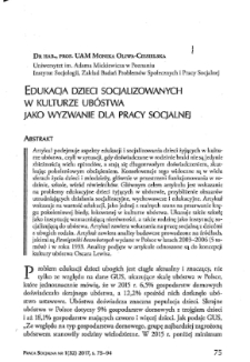 Artykuł podejmuje aspekty edukacji i socjalizowania dzieci żyjących w kulturze ubóstwa, czyli w sytuacji, gdy doświadczane w rodzinie braki nie są jedynie zbieżnością wielu epizodów, a stają się długotrwałym doświadczeniem, skutkując pokoleniowym obciążeniem. ; Konsekwencje tego widoczne są w wielu sferach życia dzieci i młodzieży, głównie w przestrzeni funkcjonowania w rodzinie, szkole, wśród rówieśników. ; Głównym celem artykułu jest wskazanie na problemy edukacyjne dzieci żyjących w ubóstwie, przybliżenie obszarów utrudniających działania socjalizacyjne, wychowawcze i edukacyjne. ; Artykuł wskazuje na wartość edukacji, jako jednej z realnych szans na przerwanie kręgu pokoleniowej biedy, lokowanej w kulturze ubóstwa. Ukazuje także szkołę jako instytucję wzmacniającą nierówności, a także rodzinę jako instytucję socjalizującą do ubóstwa. ; Artykuł zawiera wskazania na pracę socjalną z dziećmi z ubogich rodzin. Artykuł zawiera analizy badawcze prowadzone na źródłach, jakimi są ?Pamiętniki bezrobotnych? wydane w Polsce w latach 2003-2006 (5 tomów) i w roku 1933. Analizy podjęte w artykule odnoszone są do koncepcji kultury ubóstwa Oscara Lewisa. ?