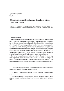 W artykule przedstawiono możliwości wykorzystania twórczego muzykoterapii w pracy z dziećmi w wieku przedszkolnym. Omówione zostały główne założenia koncepcji Nordoff-Robbins w kontekście potrzeb małego dziecka. Koncepcja przedstawiona w niniejszym opracowaniu jest szeroka, obejmuje całościowe podejście do tematu i jest wynikiem badań eksperymentalnych i studium przypadku. ; W tej perspektywie, kreatywna muzykoterapia wchodzi w "nowe obszary", które wcześniej nie były dla niej przeznaczone. Mianowicie: obszar edukacji przedszkolnej i pedagogiki włączającej. Autorka przedstawia zarys własnej koncepcji "muzycznego lustra" dziecka. Przedstawiono również wyniki badań obrazujące wpływ muzykoterapii na rozwój dzieci w wieku przedszkolnym.