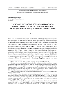 Przedmiotem artykułu jest treściowa i językowa analiza XVI-wiecznego tekstu pt. "Sermon to jest kazanie na dzień Wniebowzięcia Panny czystej (?)" autorstwa toruńskiego kaznodziei Piotra Artomiusza. Celem szkicu jest przyjrzenie się językowym wykładnikom subiektywnego wartościowania wypowiedzi, ich analiza oraz omówienie ewentualnych strategii wykorzystanych przez autora w celu przekazania określonych treści i obrony prawd wiary. ; Jako tło porównawcze omawianych zagadnień wykorzystano katolickie kazanie Piotra Skargi napisane na ten sam dzień kalendarza liturgicznego - 15 sierpnia - święto Wniebowzięcia NMP (1595). Analiza treściowa tekstów dowiodła, że polemiczne kazanie Artomiusza wpisuje się w ówczesny dyskurs religijny i reprezentuje raczej umiarkowany odłam luteranizmu. ; Zdolności kaznodziejskie toruńskiego pastora ujawniają się nie tylko na płaszczyźnie treściowej, ale również językowej. W celu przekazania określonych treści i przekonania do nich odbiorcy wykorzystuje on bowiem różne środki perswazji i językowe wykładniki stylu retorycznego, z których niektóre zostały w artykule wskazane i omówione (np. porównania, przeciwstawienia, słownictwo wartościujące, pytania retoryczne).