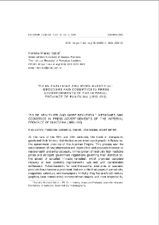 Na przełomie XIX i XX wieku gospodarka towarowa oraz wewnętrzna dystrybucja preparatów o działaniu leczniczym przeżywały gwałtowny rozwój w najbardziej wysuniętej na wschód prowincji imperium austriackiego - Bukowinie. Proces ten doprowadził do otwierania nowych aptek oraz składów, które oferowały preparaty mające na celu przywrócenie zdrowia i piękna ludziom. ; W kontekście stosunkowo wysokich cen leków oraz surowych zasad ich dystrybucji, regulowanych przepisami rządowymi, pojawienie się tzw. "cudownych środków", które obiecywały całkowite wyleczenie lub poprawę wyglądu aż po upiększenie ciała, spotkało się z dużym zainteresowaniem. ; Reklamy leków dostępnych bez recepty oraz produktów kosmetycznych stały się powszechne na ostatnich stronach czasopism, magazynów, kalendarzy i gazet. Początkowo miały one prymitywną grafikę, potem bardziej dopracowaną, a przede wszystkim ekscytujące teksty, które informowały o działaniu konkretnego leku lub kosmetyku, na jakie dolegliwości można go stosować, gdzie go kupić i - co najważniejsze - jaka jest jego cena. ; Celem artykułu jest przedstawienie niektórych z najbardziej rozpowszechnionych i wielokrotnie powtarzanych reklam w prasie centralnej Bukowiny (1880-1910), w czasach, gdy potrzeba dostosowania się do "cywilizacji zachodniej" stawała się coraz bardziej widoczna, przynajmniej w miastach, co obejmowało również dostęp do środków zdrowotnych i kosmetycznych. ; Rozwój tego typu handlu wskazuje zarówno na wiarę w alternatywę (naukową i racjonalną) wobec recept lekarskich, jak i na rosnące zainteresowanie coraz bardziej zróżnicowanej grupy odbiorców produktami, które przestały być skierowane wyłącznie do elity społecznej.