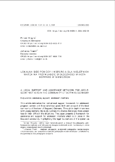 W artykule dokonano charakterystyki instytucjonalnej pomocy dla nieletnich ciężarnych kobiet oraz tych, które urodziły dziecko i funkcjonują w społeczności lokalnej miasta Boppard w Niemczech. W biogramach młodych matek, z którymi przeprowadzono wywiady pogłębione, zarysowano różnorodność problemów z jakimi borykają się młode kobiety w trudnej dla nich sytuacji życiowej. ; W opracowaniu zarysowano schemat pomocy i wsparcia dla nieletnich matek, jaki funkcjonuje w społeczności miasta Boppard z uwzględnieniem aktów prawnych na których opiera się system oraz aspektów funkcjonalnych, ze szczególnym akcentem na elastyczność działań z wykorzystaniem wszelkich dostępnych środowiskowo służb i organizacji.