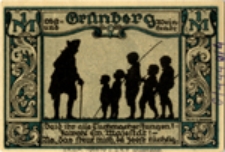 awers: po środku klęczący młody człowiek trzymający tacę z kielichem, kiścią winogron i tkackim czółnem; nad nim napis: Die Stadtbank Grünberg in Schlesien zahle gegen diesen Scheck aus me inem Guthaben an der Inhalber ... Pfennig (Bank Miasta Zielonej Góry wypłaci za ten czek z mojej należności na właściciela ... fenigów); kolor zielono-kremowo-czarny ; rewers: rozmowa cesarza Fryderyka z uczniami tkackimi; kolor zielono-kremowo-czarny ; 90 mm x 60 mm