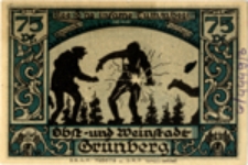 awers: po środku klęczący młody człowiek trzymający tacę z kielichem, kiścią winogron i tkackim czółnem; nad nim napis: Die Stadtbank Grünberg in Schlesien zahle gegen diesen Scheck aus me inem Guthaben an der Inhalber ... Pfennig (Bank Miasta Zielonej Góry wypłaci za ten czek z mojej należności na właściciela ... fenigów); kolor zielono-kremowo-czarny ; rewers: plądrowanie miasta przez wojska cesarskie w 1646 roku; kolor zielono-kremowo-czarny ; 90 mm x 60 mm
