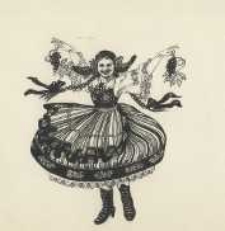 Rysunek powstał jako projekt ilustracji do książki. ; Przedstawia: Na białym tle dziewczyna w łowickim stroju ludowym. Postać ukazana w ruchu, obraca się z uniesionymi rękami, w których trzyma kiście winogron.