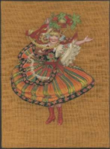 Rysunek powstał jako projekt ilustracji do książki. ; Przedstawia: Na pomarańczowym płótnie naklejona wycięta z kartonu sylwetka łowiczanki. Namalowana czarnym tuszem i gwaszami. Przedstawiona w wirze tańca z uniesionymi rękami i trzymająca w dłoni gałązkę winorośli.