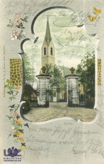 Stempel pocztowy: Crossen 29.5.05 ; Stempel pocztowy: Cottbus 29.5.05 ; pocztówka barwna ; Przedstawia neogotycki kościół ewangelicki w miejscowości Nietków (niem. Poln. Nettkow) w woj. lubuskim, w pow. zielonogórskim. Początek XX w. Kartka dekoracyjna, ozdobiona motywem florystycznym: kwiatami jabłoni, wiśni i girlandą kolorowego bluszczu. Kościół, obecnie katolicki pw. Wniebowstąpienia Pana Jezusa, na przedstawieniu ujęty w dekoracyjnie wycinaną ramę.