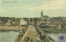 Stempel pocztowy: Züllichau - 9.9.08. ; pocztówka barwna ; Przedstawia grupę ludzi stojących na drewnianym moście na Odrze w miejscowości Cigacice w pow. zielonogórskim, w woj. lubuskim (niem. Tschichertzig a.d. Oder). Drewniany most, wybudowany w 1862 r., w 1925 r. został zastąpiony mostem stalowym wykonanym w Zakładzie Konstrukcji Stalowych i Mostowych Beuchelt & Co w Zielonej Górze.