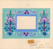 gwasz, karton ; 24,5 x 28 cm ; Projekt il. strony tutułowej, dodatku nutowego ; Ilustracja zabezpieczona kalką techniczną ; Przedstawia: Ozdobna rama przeznaczona na tytuł dodatku: nuty. Po obu stronach stylizowane na ludowe bukiety kwiatów. U góry i dołu drobniejsze motywy zdobnicze. W środku pusty prostokąt przeznaczony na napis "Nuty". Projekt w kolorystyce zieleni, różów i fioletów.