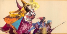 gwasz, karton ; 24,5 x 51 cm ; Projekt il. ze s. 6 ; Ilustracja zabezpieczona kalką techniczną ; Przedstawia: Pochód Lajkonika. Brodaty jeździec w pseudoorientalnym stroju jedzie na sztucznym koniu dekoracyjnie przybranym. Przed Lajkonikiem idzie dobosz z bębenkiem i drugi młody mężczyzna z włócznią. Kolorystyka projektu bardzo bogata.