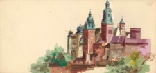 gwasz, karton ; 24,5 x 51 cm ; Projekt il. ze s. 17 ; Ilustracja zabezpieczona kalką techniczną ; Przedstawia: Widok Wawelu. Kompozycja utrzymana w kolorach brązów, różów i zieleni.