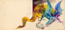 gwasz, karton ; 24,5 x 51 cm ; Projekt il. ze s. 18-19 ; Ilustracja zabezpieczona kalką techniczną ; Przedstawia: Kolorowy uskrzydlony smok, z wyciągniętym jęzorem pochyla się nad martwą owieczką. Kompozycja utrzymana w kolorach żółci, różów i niebieskości.