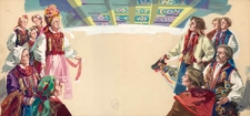 gwasz, karton ; 24,5 x 51 cm ; Przedstawia: Scena we wnętrzu wiejskiej chaty z bogato malowaną powałą. Z prawej strony grupa mężczyzn z panem młodym na czele. Z lewej grupa kobiet z panną młodą w wianku na czele. Wszyscy w paradnych krakowskich strojach. Projekt w kolorystyce czerwieni, zieleni, różów i niebieskości.