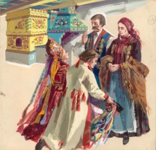 gwasz, karton ; 24,5 x 28 cm ; Przedstawia: Błogosławiny. Wnętrze chaty z bogato malowanym piecem. Odświętnie ubrani rodzice błogosławią parę młodą przed ślubem. Wszyscy ubrani są w tradycyjne, krakowskie stroje.