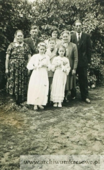 Pańczyszyn, Zofia (z d. Czerniecka, 1926-2004) ; Pańczyszyn, Jan (syn Piotra) ; Pańczyszyn, Stanisław Zygmunt (syn Jana) ; Pańczyszyn, Wanda (córka Jana) ; Wilk, Michał ; Wilk, Stefania ; Wilk, Stanisława ; Wilk, Irena ; kościół katolicki ; obrzędy polskie ; Pyrzany (woj. lubuskie) ; fotografia