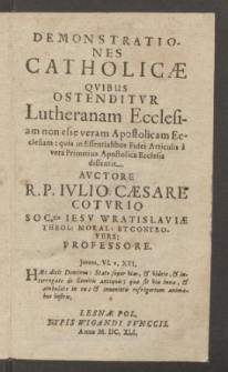 [10], 415, [11] s., [1] k. front. miedzoryt ; 8' ; E XIV, 432 ; Miedziorytowy frontispis z personifikacją Kościoła, nad którą unosi się Duch Święty, poniżej na postumentach dwie postacie kobiece, symbolizujące słowo Boże pisane i głoszone ; Na kartach występują drzeworytowe winiety i inicjały ; Oprawa: karton, pergamin, na grzbiecie odręczny napis nieczytelny