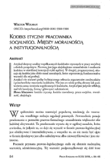 Artykuł dotyczy analizy współczesnych kodeksów etycznych w pracy socjalnej z dwóch perspektyw. Pierwszą jest jego aksjologiczne uzasadnienie i osadzenie kodeksu w określonej koncepcji etyki ogólnej. W drugiej, pragmatycznej, ukazuje się kodeks jako zbiór zasad moralnych, które reprezentują fundamentalne wartości dla tej profesji. ; Artykuł nie stanowi próby holistycznego zebrania argumentów zwolenników i przeciwników tworzenia kodeksów. Nie jest on także próbą obrony lub podważenia sensu istnienia współczesnych kodeksów. Artykuł jest jedynie refleksją nad ich kondycją, formą i głównymi założeniami.