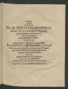 Tytuł: Viro Clarissimo ... Erico Pelshofero, ... Ducalis Paedagogii, quod est Stetini, Subrectori ac Eloquentiae Professori, cum Prudicissima Virgine Lucia [...]