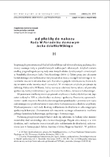 The article contains a pragma-linguistic analysis of "advice" and other directive act`s established in the "Home guidance" by Jacek Dziarkowski (1819). The aim of this study is to show the contextual conditions of the speech act interpretation. The source represents the utility genre with a teaching function. The pieces of "advice" selected from it illustrate urging to take some actions in order to achieve social benefits. ; The supreme position in the guidance take speech acts (simple genres): "advice, gift, warning, obligation, rule, indication, conditio". These categories of genres became constitutive elements of the guidance, arranging and prioritizing the structure of the text and informing about the basic intention of the message sender. ; J. Dziarkowski chose a rather mild form of persuasion, he avoided expressing direct orders. He focused his attention on knowledge, treating other aspects of communication as collateral. The "guiding nature" of this publication is determined by the selection of content and its normative character.
