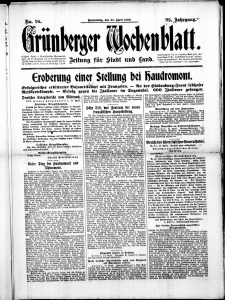 Title: Grünberger Wochenblatt: Zeitung für Stadt und Land, No. 94. (20. April 1916)