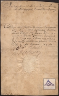 Tytuł: Pokwitowanie na trzy tysiące złotych dla skarbu koronnego, podpisane i opieczętowane przez Szczęsnego Kazimierza Potockiego
