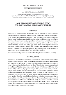 The Great Tit "Parus major" and the Blue Tit "Cyanistes caeruleus" are the only Western Palearctic Parids that maintain numerous urban populations as well as forest populations. Because of their evolutionary history both these species are best adapted to different types of deciduous and mixed forests. Ecological conditions in cities are different from those dominating in forests, especially in such aspects as: habitat fragmentation, tree species composition, microclimate, human activity, predators and food conditions. ; The tits breeding in cities start laying eggs earlier in the season, lay smaller clutches and fledge fewer fledglings of lower quality. Yet urban populations are often relatively stable in numbers. This may result from the fact that survival of winter is higher in cities due to increased availability of food and milder weather.