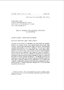 Celem artykułu jest odpowiedź na pytanie do jakich aktywności należy klasyfikować grę w szachy. Na podstawie przeglądu literatury zostały zaproponowane trzy możliwe odpowiedzi na powyższy problem: szachy są sportem, szachy są grą i zabawą, szachy są e-sportem. Koncepcje teoretyczne zostały poddane empirycznej weryfikacji. Przeprowadzono 18 indywidualnych wywiadów pogłębionych. Respondentami byli: aktywni szachiści, rodzice zawodników, instruktorzy szachowi, amatorzy królewskiej gry, fani e-sportu oraz gier komputerowych, osoby niezainteresowane szachami oraz e-sportem. ; Badanie poszerzono o obserwację procesu szkoleniowego oraz uczestnictwa we współzawodnictwie sportowym przedstawicieli sekcji szachowych klubów: Jagiellonia Białystok oraz MUKS Stoczek 45 Białystok. Badania potwierdziły brak jednolitej definicji szachów. Szachy zostały uznane za coś więcej niż grę i zabawę przez respondentów. Jednocześnie zarejestrowano głosy, które odmawiają królewskiej grze miana sportu, z powodu braku aktywności fizycznej. Cenne poznawczo są zdiagnozowane możliwości rozwoju szachów jako e-sportu.