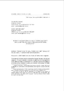 Głównym celem artykułu jest analiza zależności między migracją międzynarodową, wydarzeniami życiowymi związanymi z wchodzeniem w dorosłość i nabywaniem kompetencji miękkich w wyniku pracy i życia za granicą. Artykuł powstał na podstawie ankiety internetowej przeprowadzonej wiosnąi latem 2020 roku wśród 740 polskich i litewskich migrantów powrotnych zWielkiej Brytanii, którzy wrócili do Polski i na Litwę. ; Migracje zagraniczne pomogły im, przede wszystkim, w nabyciu zarówno kompetencji komunikacyjnych w języku angielskim, jak i pracy zespołowej - kompetencji miękkich, które są ważne dla rozwoju kariery. W obu grupach migrantów powrotnych z Polski i Litwy migracje zagraniczne przyspieszyły trzy kluczowe procesy: 1. rozpoczęcie samodzielnego podejmowania decyzji; 2. uniezależnienie się finansowo od rodziców oraz 3. znalezienie stabilnego zatrudnienia. W obu grupach usamodzielnienie się finansowo wiązało się istotnie z wysokim poziomem kompetencji miękkich nabytych za granicą.