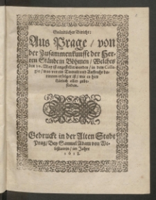 [8] s. ; 16° ; Dzieło stanowi całość z tekstem: Milner von Milhausen, Peter, Apologia, Oder entschuldigungs Schrifft, Aus was für unvermeidlichen ursachen, alle drei Stende des löblichen Königreiches Bohaimb, Sub utraq[ue], ein Defension werck anstellen müssen. Sygnatura S406/[3] ; Oprawa: karton, pergamin, ubytki na grzbiecie. Ślady po zalaniu.