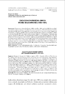 During the first period of Solidarity (summer 1980 ? December 1981), the West German left, represented by the Social Democratic Party of Germany and the German Trade Union Federation, took an ambiguous position towards the events in Poland. In contrast, the smaller New Left groups, the Trotskyists or Maoists associated with left-wing trade unionists linked to the DGB, and the left wing of the SPD were relatively quick to establish contacts with Solidarity and to launch a campaign of suport for the Polish workers. ; Their involvement stemmed from their assessment of the Polish new movement as a major force fighting for democratic rights and the improvement of the economic situation of workers within the existing political system. The left did not see Solidarity as a manifestation of an attack on the ruling party. The postulated reforms were to be introduced not against the communist party, but in cooperation with it. It was on the initiative of various left-wing organisations that Solidarity with Solidarity was founded, which organised a number of campaigns in support of Polish workers and also collected finances for the purchase of printing equipment.