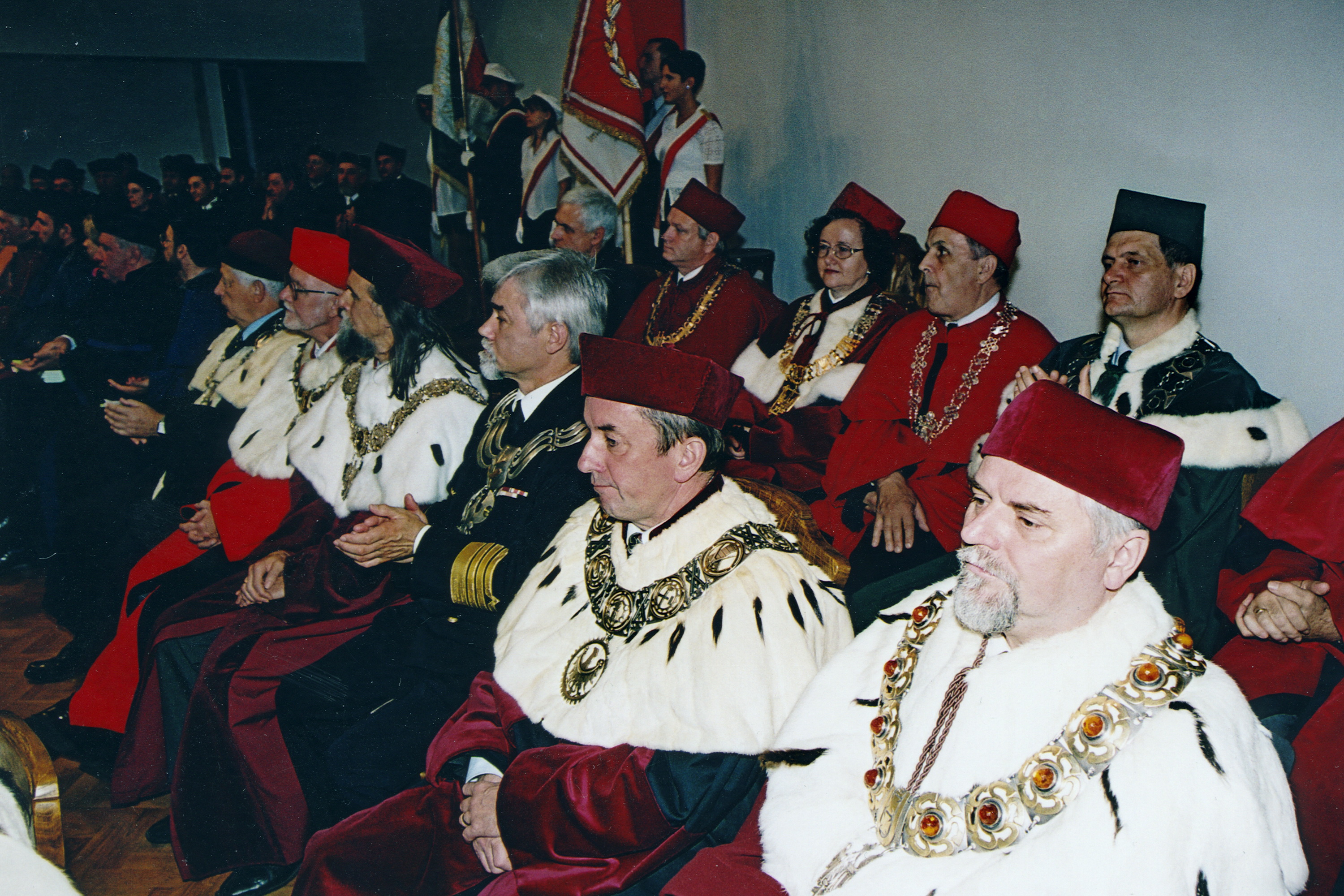 Na pierwszym planie reprezentacja rektorów uczelni polskich w ceremonialnych strojach i insygniach władzy swoich uczelni ; W głębi senatorzy Uniwersytetu Zielonogórskiego ; Z tyłu poczty sztandarowe połączonych uczelni: Wyższej Szkoły Pedagogicznej im. Tadeusza Kotarbińskiego i Politechniki Zielonogórskiej