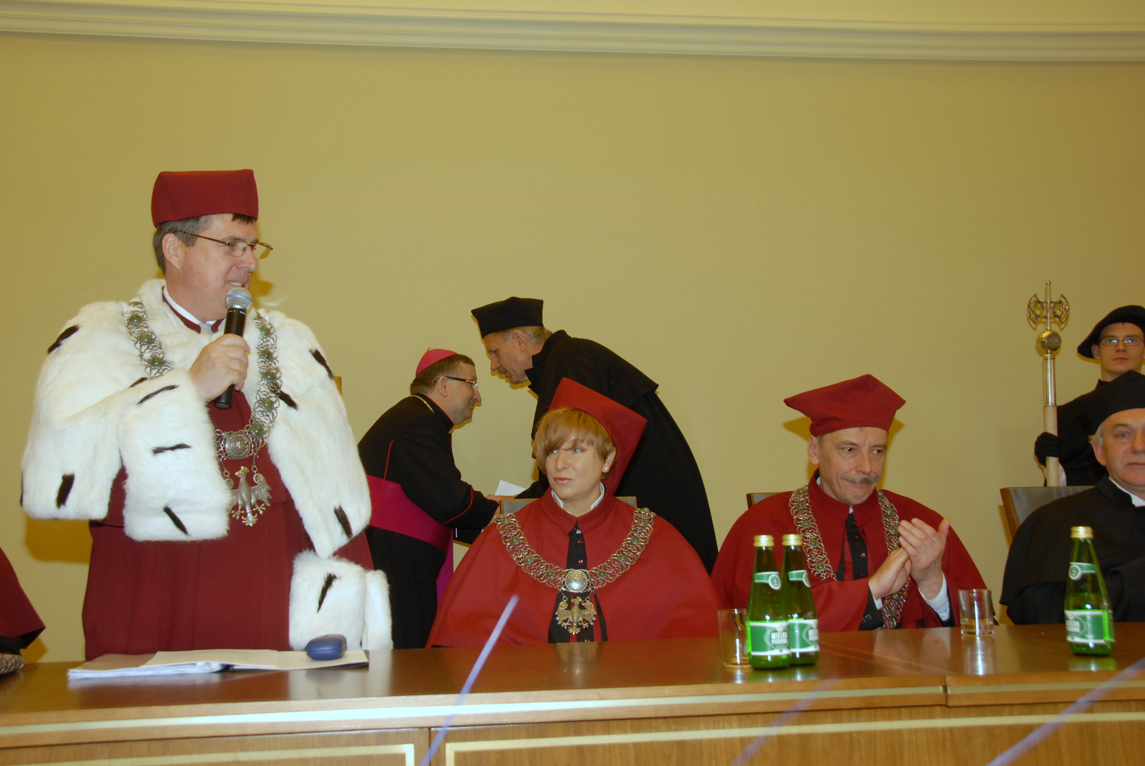 Opis:Uroczystość odbyła się 5 czerwca 2009 r. w auli rektoratu Uniwersytetu Zielonogórskiego ; Głos zabiera prof. dr hab. Czesław Osękowski, rektor Uniwersytetu Zielonogórskiego ; Za stołem prezydialnym miejsca zajmuą od lewej: dr hab. Wielisława Osmańska-Furmanek, prof. UZ, prorektor ds. Jakości Kształcenia; dr hab Longin Rybiński, prof. UZ, prorektor ds. Studenckich; prof. dr hab. inż. Józef Korbicz, promotor przewodu ; W głębi bp dr Stefan Regmut składa gratulacje prof. dr. hab. inż. Janowi Węglarzowi