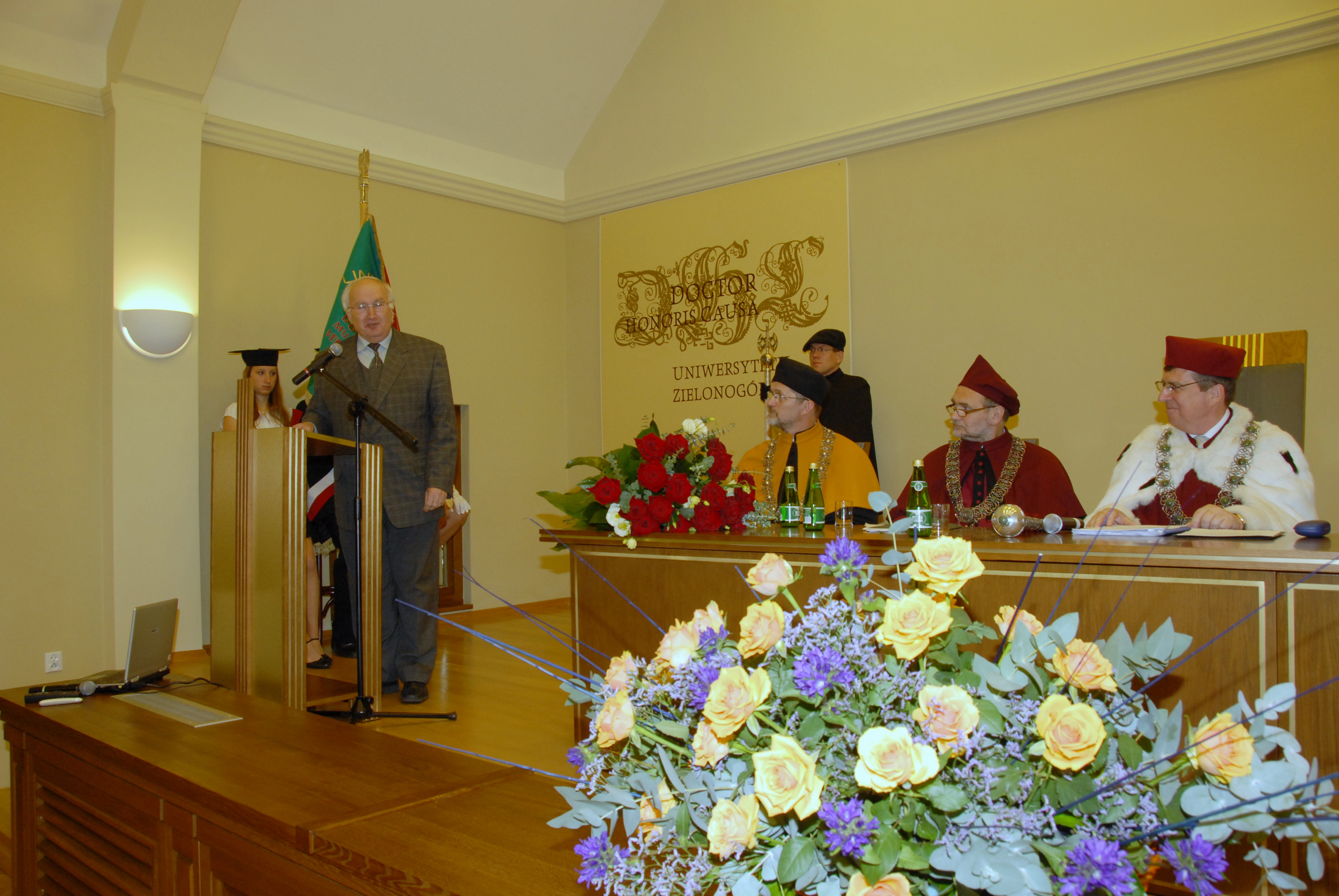 Opis:Uroczystość odbyła się 5 czerwca 2009 r. w auli rektoratu Uniwersytetu Zielonogórskiego ; Wystąpienie zaproszonych gości ; Za stołem prezydialnym miejsca zajmują od lewej: dr hab. inż. Andrzej Pieczyński, prof. UZ, dziekan Wydziału Elektrotechniki, Informatyki i Telekomunikacji; prof. dr hab. inż. Tadeusz Kuczyński, prorektor ds. Nauki i Współpracy z Zagranicą; prof. dr hab. Czesław Osękowski, rektor Uniwersytetu Zielonogórskiego
