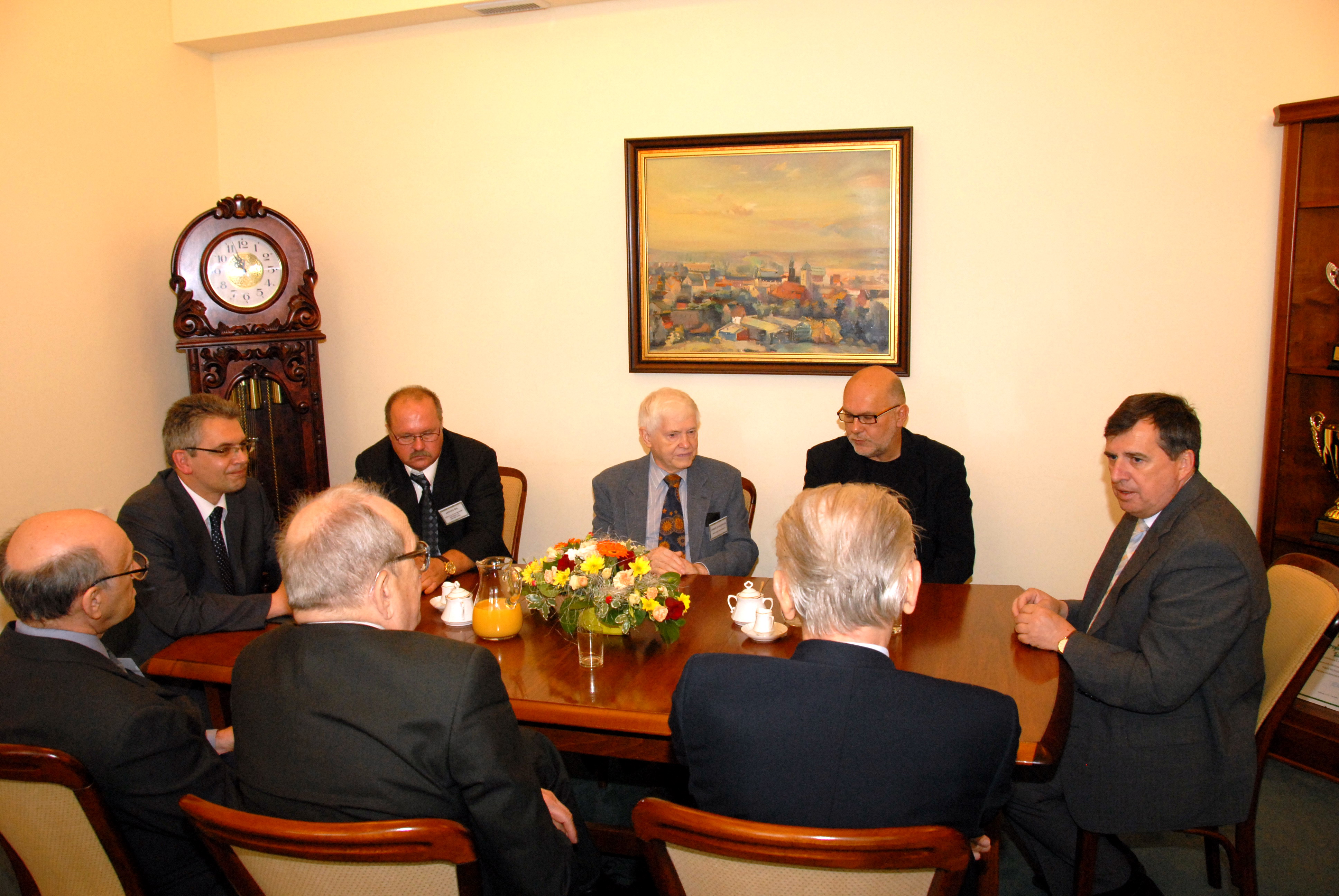 Opis:Uroczystość odbyła się 23 czerwca 2008 r. w auli Uniwersytetu Zielonogórskiego ; Spotkanie w gabinecie JM Rektora Uniwersytetu Zielonogórskiego. ; Od lewej: dr hab. Wojciech Strzyżewski, dziekan Wydziału Humanistycznego UZ; prof. Janusz Gil, dyrektor Instytutu Astronomii UZ; prof. Owen Gingerich, Harvard University; Zbigniew Adaszyński, tłumacz; prof. Czesław Osękowski, rektor Uniwersytetu Zielonogórskiego