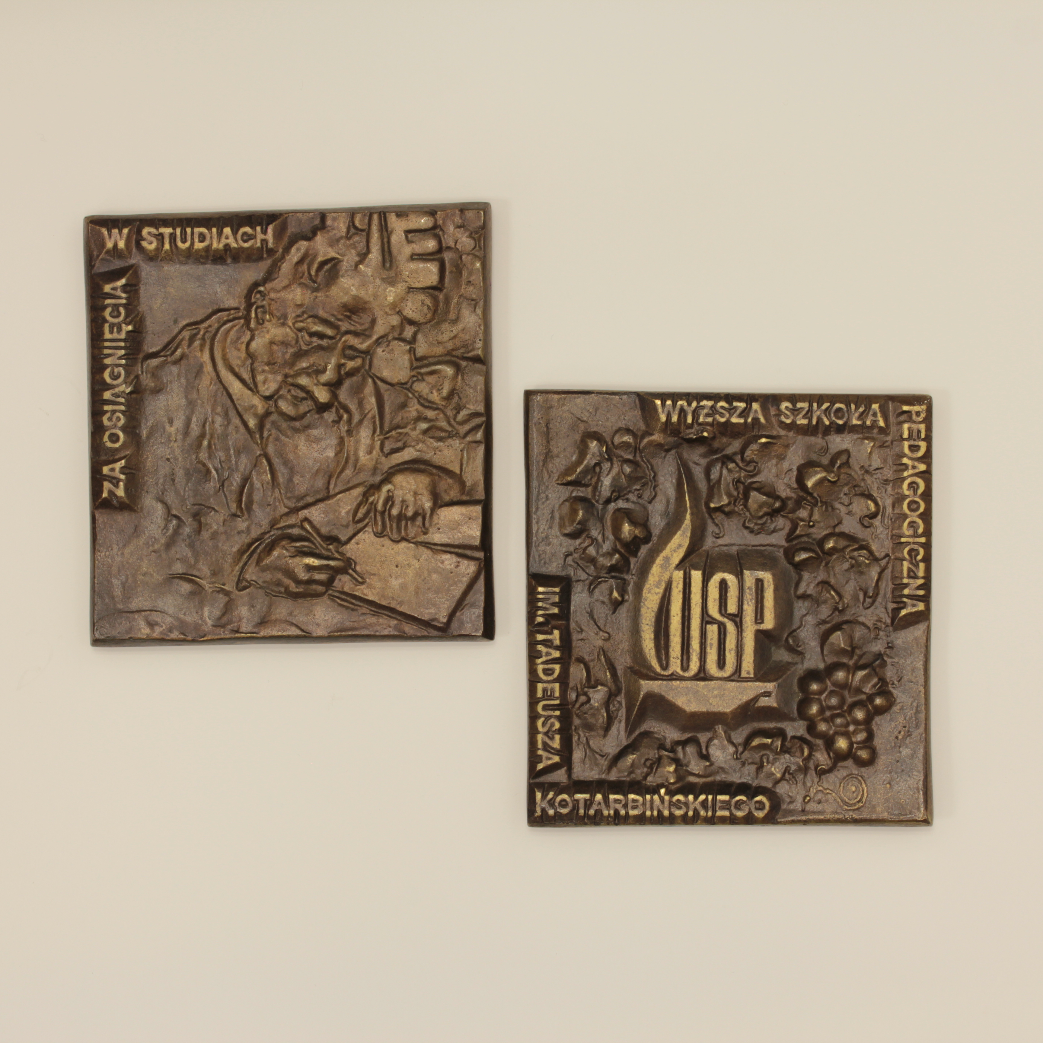 Opis:Awers: logo WSP wokół kiści winogron, napis po przekątnej: "Wyższa Szkoła Pedagogiczna im. Tadeusza Kotarbińskiego" ; Rewers: podobizna Tadeusza Kotarbińskiego, napis w lewym górnym rogu: "Za osiągnięcia w studiach" ; Medal wykonany z brązu ; 10,5 cm x 12 cm × głęb. 1,4 cm